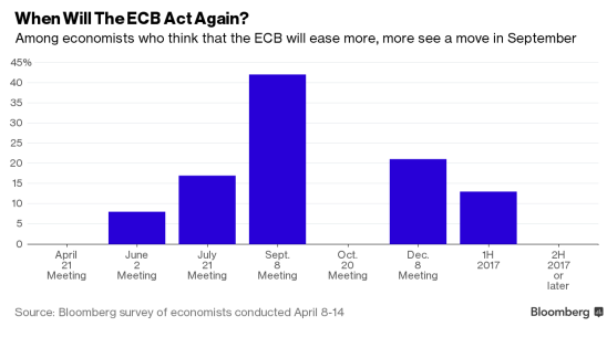 Для того чтобы ревальвация доллара была поставлена на прочный фундамент, необходим рост уверенности инвесторов в продолжении цикла нормализации денежно-кредитной политики, что, вероятнее всего, будет происходить в мае-июне, пока же конкуренты гринбека могут использовать собственные козыри. Если, конечно, они в этом нуждаются. «Голубиные» спичи представителей центробанков, имеющие место в последние дни, сеют серьезные сомнения по этому поводу, позволяя говорить о новом витке валютных войн. Так Марио Драги отметил, что слабость рынков развивающихся стран, неясные перспективы нефти и геополитические риски тормозят европейский HCPI и подталкивают ЕЦБ к дальнейшим действиям. По мнению большей части из 47 экспертов Bloomberg, Франкфурт решится на расширение пакета стимулирующих мер в сентябре, четверть респондентов полагают, что это произойдет уже в июне-июле.