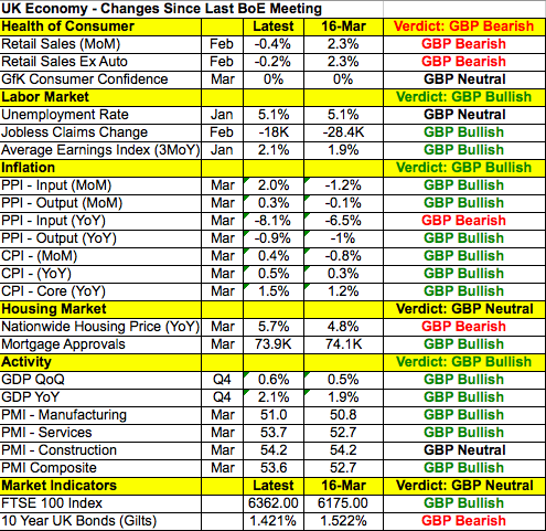 Поскольку Банк Канады уже опубликовал решение, внимание переключится на фунт и заседание Банка Англии по монетарной политике. Со времени предыдущего заседания Банка Англии в британской экономике произошло много положительных изменений. Приведенная ниже таблица показывает увеличение активности в производственном секторе и сфере услуг, ускорение роста зарплат, снижение количества заявок на пособие по безработице и повышение потребительских цен. К сожалению, расходы остаются слабыми, а возможный выход Великобритании из ЕС является постоянной угрозой для экономики. На последнем заседании Банк Англии предупредил, что референдум по поводу членства в ЕС может повлиять на расходы, но потратил большую часть своего заявления на разговоры о благоприятных финансовых условиях, увеличении расходов и своих опасениях по поводу макроэкономического влияния инфляции на зарплаты. Возможно, в этот раз заявление будет похожим.