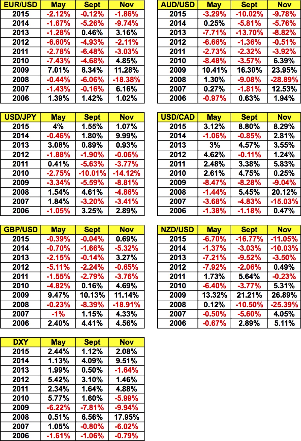 Вместо этого можно использовать стратегию, которая предполагает продажу EUR/USD и GBP/USD в начале мая и покупку их в конце месяца, поскольку эти валюты падали в мае восемь из последних десяти лет. Неудивительно, что покупать доллары (индекс доллара) 1-го мая и продавать его 31-го мая тоже было выгодно восемь из последних десяти лет. Тем, кто продает австралийские и новозеландские доллары, наоборот стоило бы набраться терпения. Хотя приведенная ниже таблица показывает, что AUD/USD падал шесть из последних десяти лет (и вырос менее чем на 0,3% в два года из оставшихся четырех), лучшая стратегия для обеих валют — это продавать в мае и покупать, когда все вернутся из летних отпусков в начале сентября. Никакой заметной тенденции в торговле USD/JPY нет, а вот для USD/CAD покупать в мае и продавать в ноябре — это лучшая стратегия.