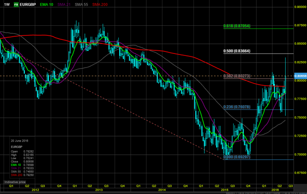 EURGBP – это пара, которая демонстрировала наиболее высокую волатильность, дальше важно понять, насколько Брекзит будет способствовать развитию экзистенционального кризиса в ЕС. Если пара сможет полностью отыграть реакцию и закрыться ниже 0,7900, медведи перехватят инициативу. В противном случае, если евро окажется сильнее, в центре внимания будет 0,8375, а затем и 0,8700.